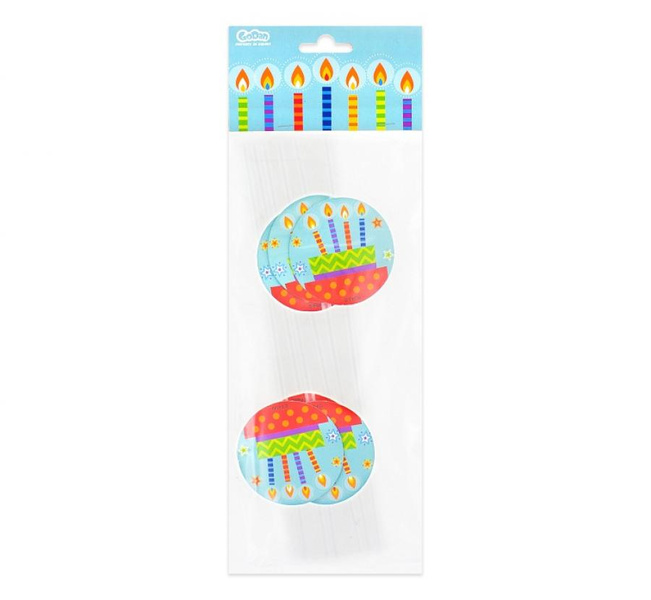 - Każda słomka posiada tekturowy medalion z kolorowym motywem tortu urodzinowego.