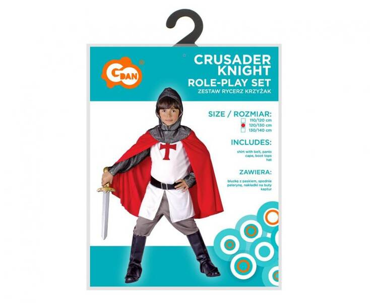 Zestaw dla dzieci Rycerz Krzyżak (bluzka z paskiem, spodnie, peleryna, nakładki na buty, kaptur), rozm.120/130 cm