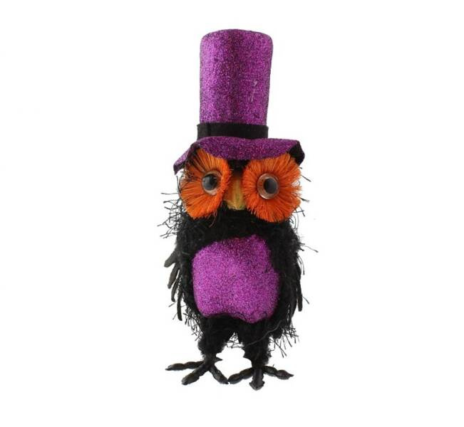 OZDOBA MAŁA SÓWKA Styropianowa ozdoba w kształcie sowy, zdobiona brokatowym materiałem. Posiada stylowy fioletowy kapelusz oraz ruchome oczy. Wysokość: 17cm. Szerokość: 6cm.