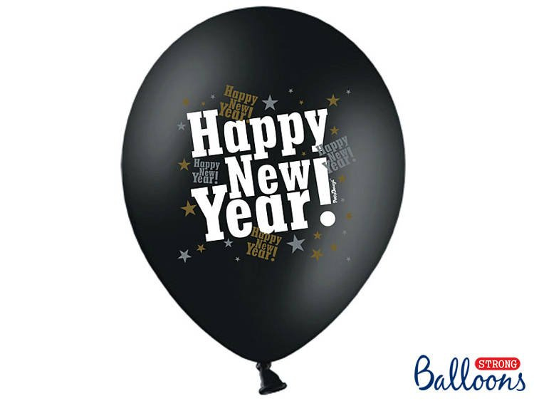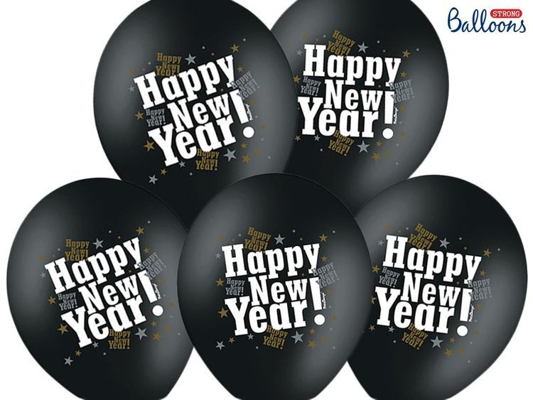 Balony w kolorze czarny metalik z biało-złoto-srebrnym, dwustronnym nadrukiem.