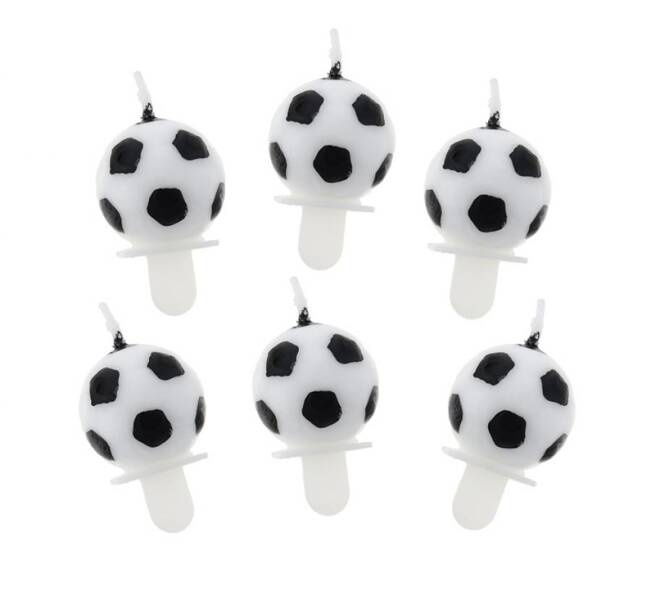 Świeczki w kształcie piłki nożnej z podstawkami.