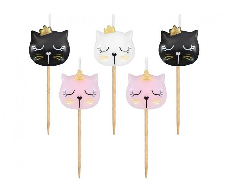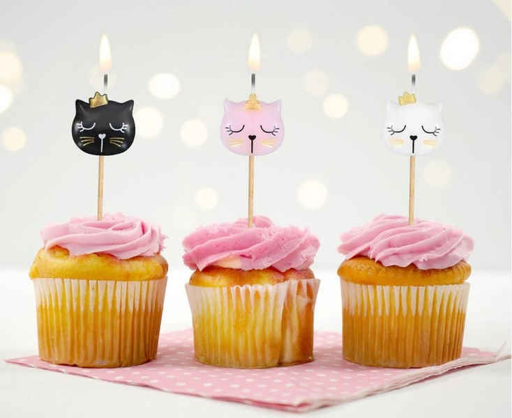 świeczki urodzinowe kotki w kolorze różowym, czarnym i biały.