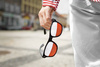 Okulary wykonane z tworzywa sztucznego w kolorze biało-czerwonym.