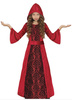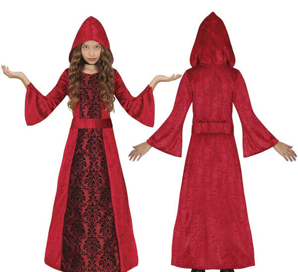Czerwona suknia z rozkloszowanymi rękawami oraz kapturem.