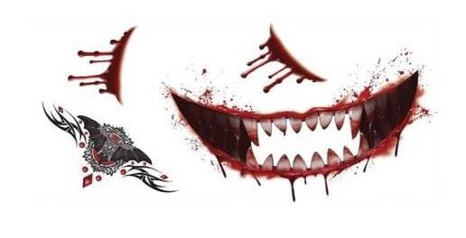 - 2 tatuaże imitujące ociekającą krew, które można umieścić na policzkach lub pod oczami, nadając efekt ran ciętych.