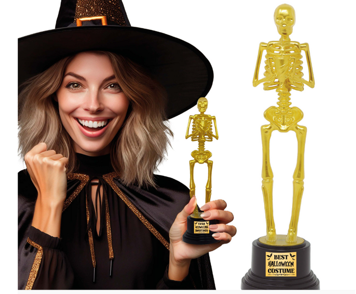 - Stoi na stabilnym, czarnym podium z ozdobną tabliczką i napisem "BEST HALLOWEEN COSTUME".