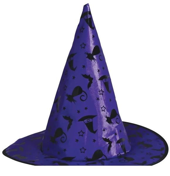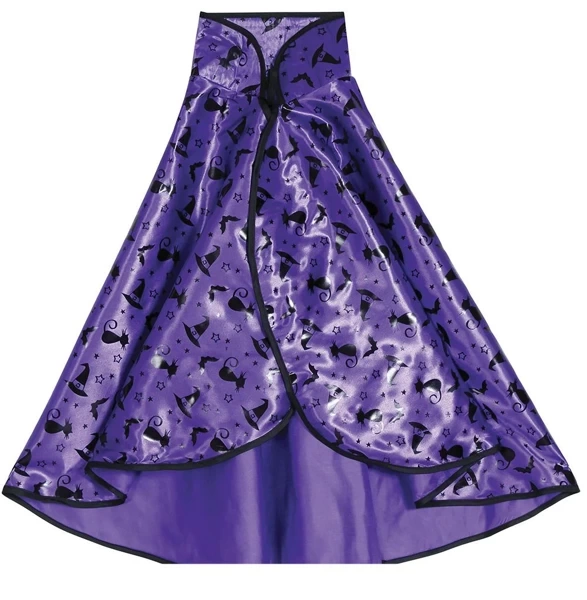 Strój w kolorze fioletowym zdobiony czarnymi kotami.