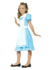 Błękitna sukienka z naszytym białym kołnierzykiem i fartuszkiem.