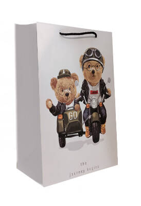 Torba prezentowa biała z nadrukiem misia oraz napisem "THE JOURNEY BEGINS".