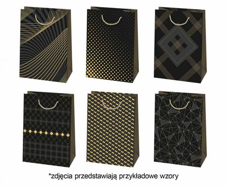 TOREBKA PREZENTOWA WZÓR OZDOBNY, ZŁOTO Wysokość: 32 cm Szerokość: 23 cm Materiał: papier Wzór: ciemne, kobiece, męskie, złote Ilość: 10 szt. Producent: POLMAK