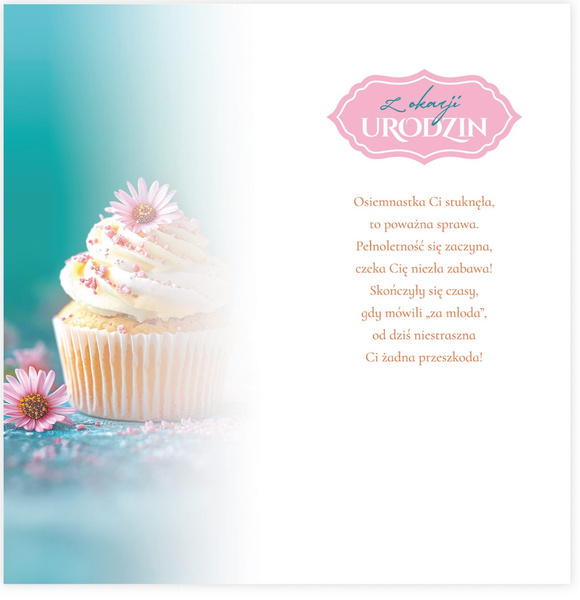 Zdobiona dużą różową cyfrą oraz babeczką.