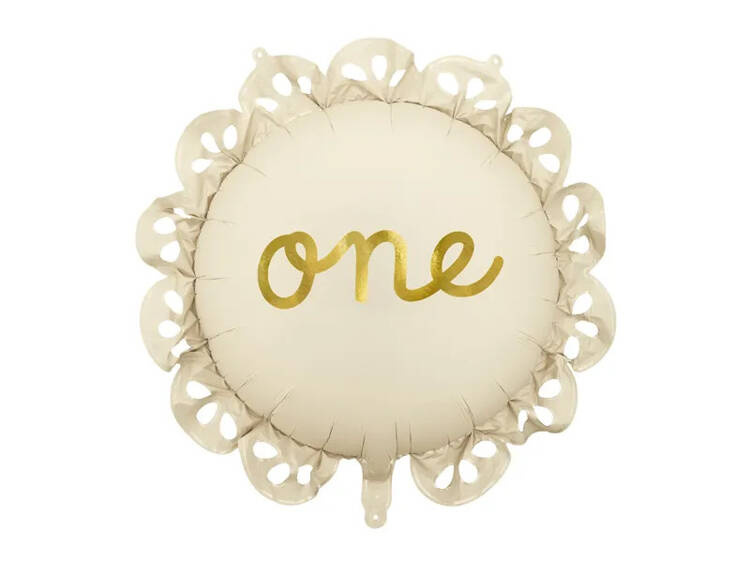 Ozdobiony falbanką na brzegach, dodatkowo posiada złoty napis ONE.
