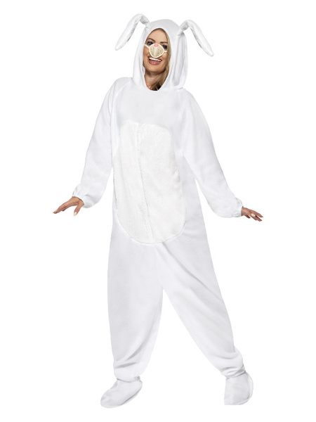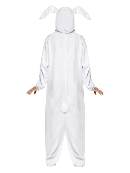 Kombinezon posiada kaptur z uszami i ogon oraz króliczy nos na gumce.