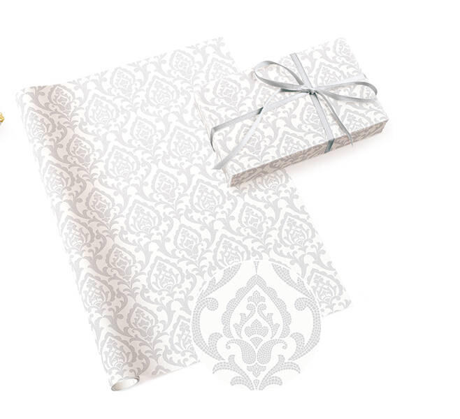 Biały Papier do Pakowania ze Srebrnym Wzorem Ornamentu.