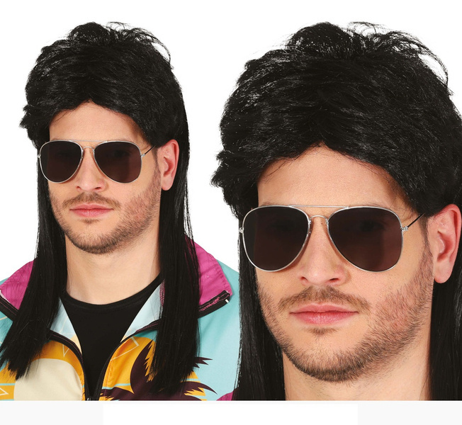 - Kolor: Czarne syntetyczne włosy, typowe dla mody z lat 70-80-tych.