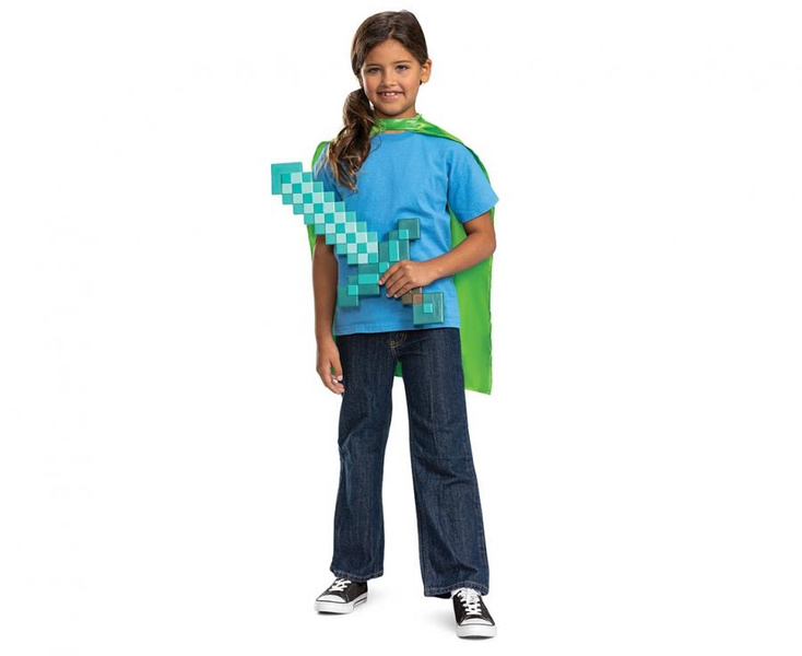 STRÓJ MINECRAFT, MIECZ I PELERYNA W skład stroju wchodzą: peleryna, miecz Szerokość w miecza: 26 cm Długość peleryny: 60cm Szerokość peleryny : 45 cm Długość miecza: 51 cm Kolor: niebieski, zielony Materiał: 100% poliester, plastik Producent: Disquise