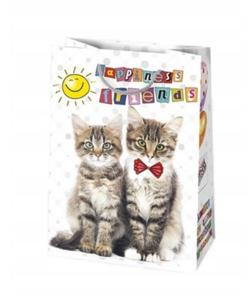 - Uroczy nadruk z dwoma kotkami i napisem "Happiness Friends", który wywołuje uśmiech na twarzy każdego obdarowanego.