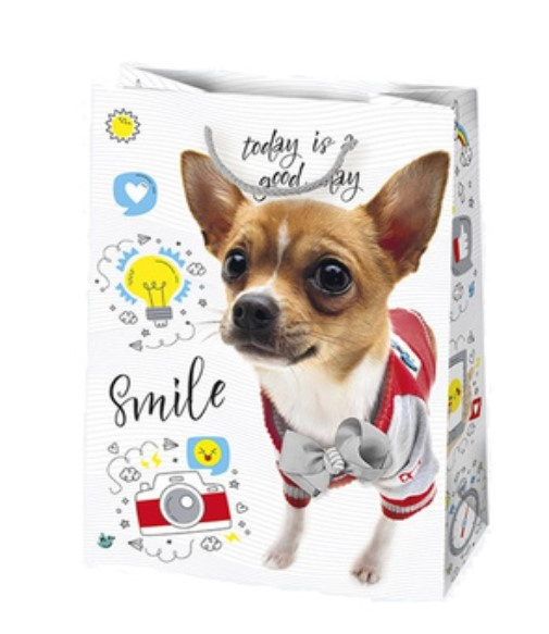 - Stylowy motyw – torebka ozdobiona grafiką uroczego chihuahua w kokardce i bluzie na tle z napisami i ozdobnymi szarymi kreskami.