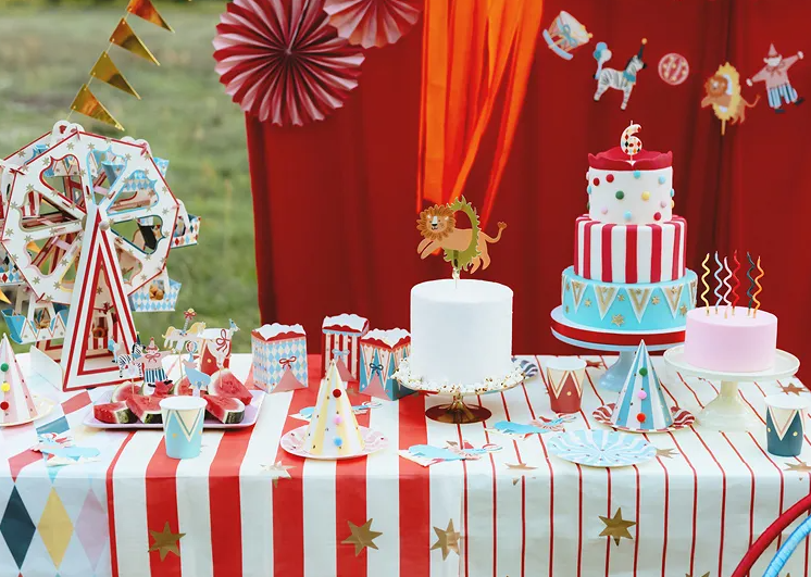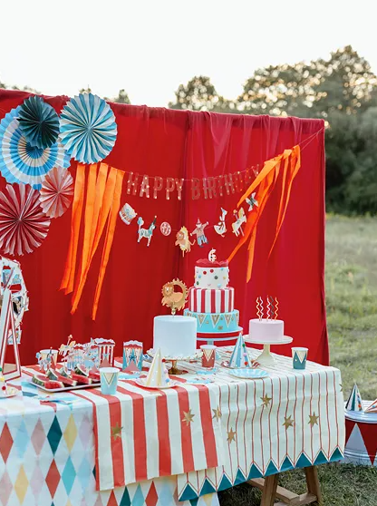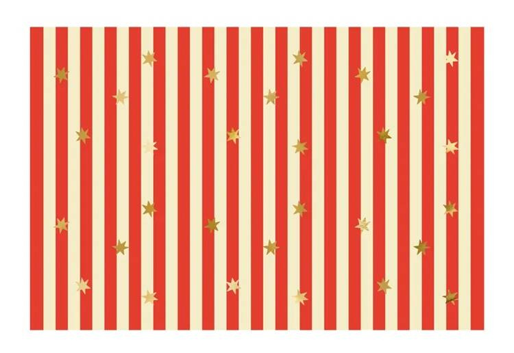 - Obrus papierowy z nadrukiem w czerwone pasy i złote gwiazdki.