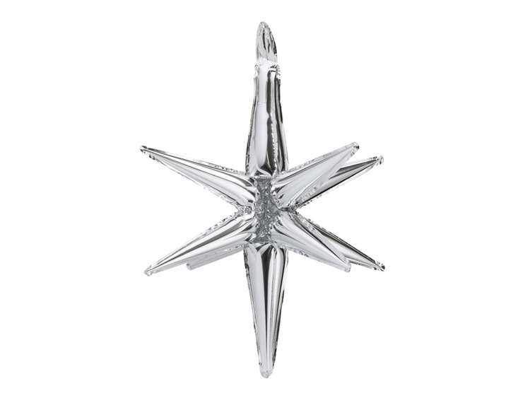 - Balon foliowy w kształcie gwiazdy 3D w eleganckim, srebrnym kolorze, doskonały do nowoczesnych i klasycznych dekoracji.