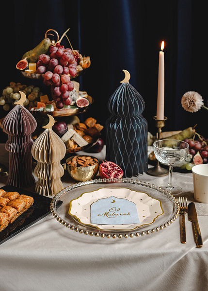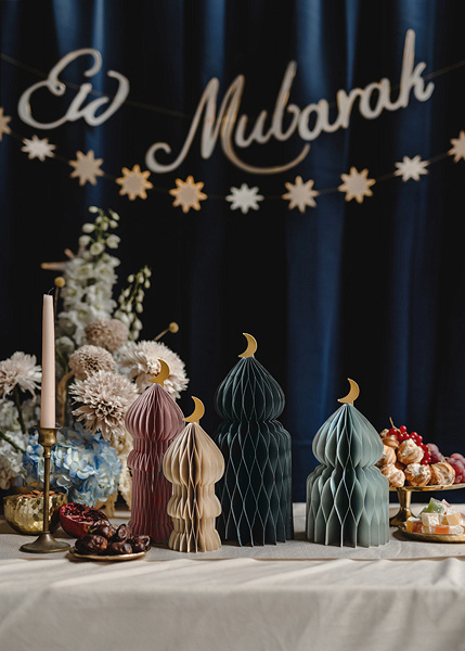 Dekoracje papierowe honeycomb Eid Mubarak, zestaw zawiera 4 dekoracje w kształcie kopuł, mix kolorów, wysokość ok. 22.5 cm, 25 cm, 28 cm i 33.5 cm. Produkt do samodzielnego złożenia. (1 op. / 4 szt.)