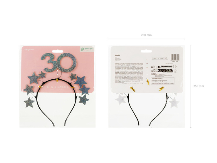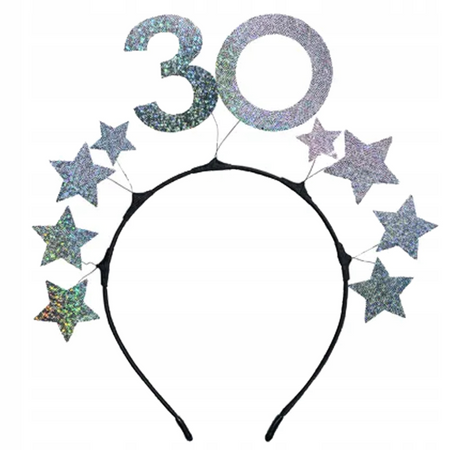 - Stylowa opaska w kolorze srebrnym, ozdobiona błyszczącymi gwiazdkami i liczbą „30”.