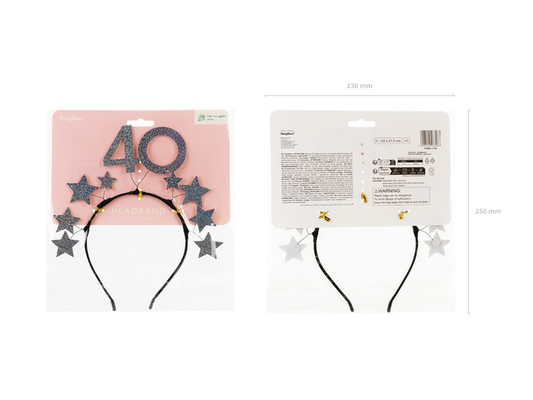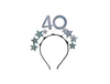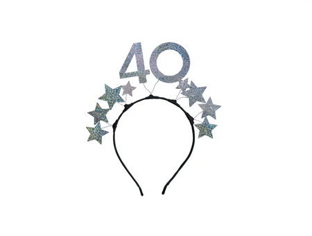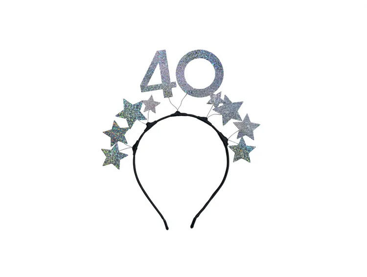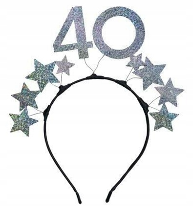 - Stylowa opaska w kolorze srebrnym, ozdobiona błyszczącymi gwiazdkami i liczbą „40”.