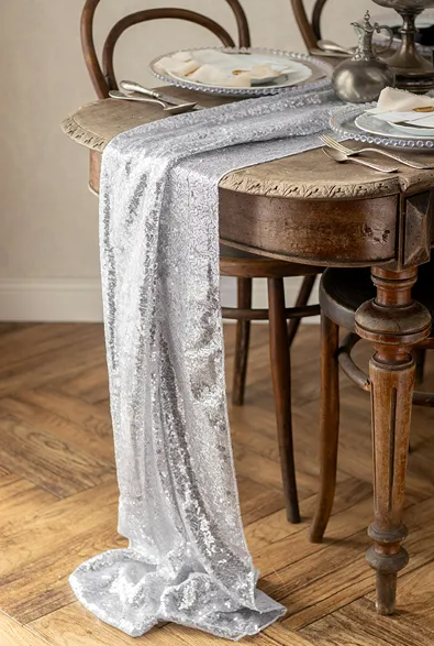 - Bieżnik wykonany z siateczki dekoracyjnej, ozdobionej srebrnymi cekinami.