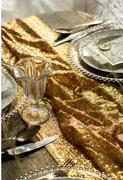 - Bieżnik wykonany z siateczki dekoracyjnej, ozdobionej złotymi cekinami.