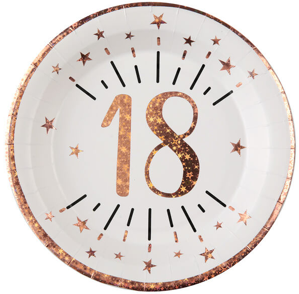 - Okrągłe talerzyki w białym kolorze z różowo-złotym nadrukiem „18”.