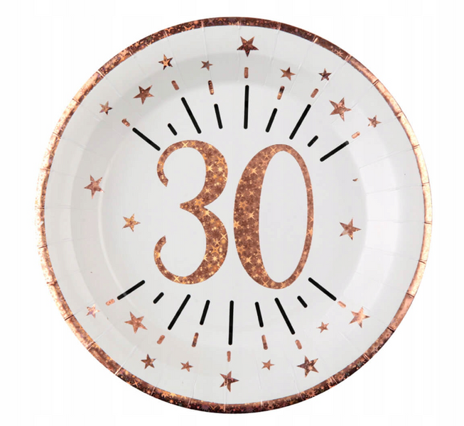 - Okrągłe talerzyki w białym kolorze z różowo-złotym nadrukiem „30”.