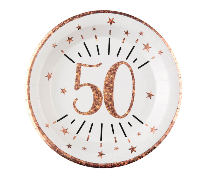 - Kolor: Białe talerzyki z różowo-złotym napisem.