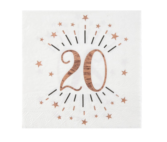 - Kwadratowe serwetki w białym kolorze z różowo-złotym nadrukiem „20”.