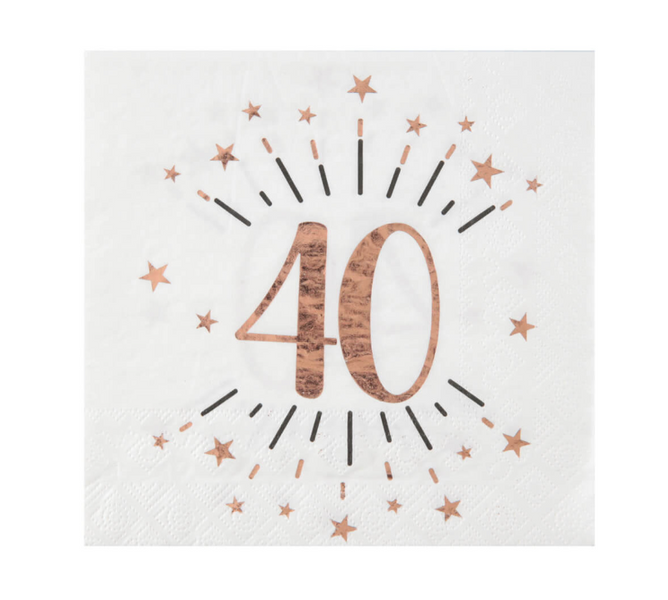 - Kwadratowe serwetki w białym kolorze z różowo-złotym nadrukiem „40”.