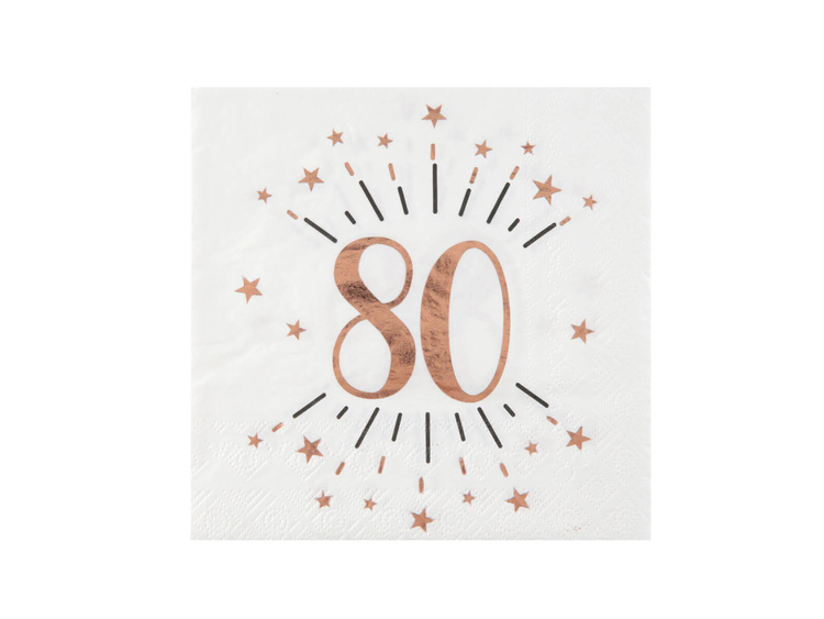 - Kwadratowe serwetki w białym kolorze z różowo-złotym nadrukiem „80”.