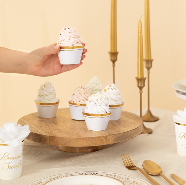 - Ekskluzywne białe foremki z delikatnym złotym wykończeniem – idealne na eleganckie przyjęcia.