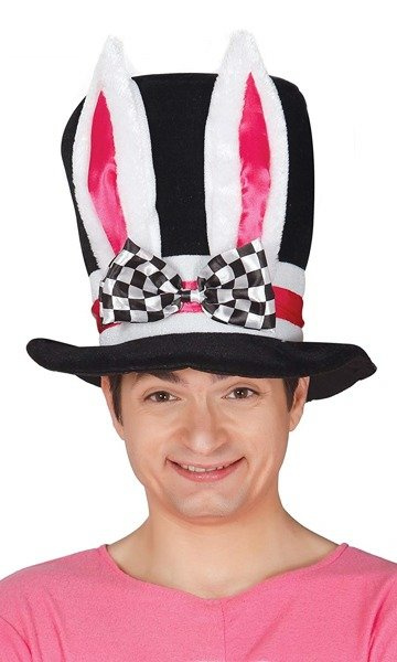 Kapelusz królika z uszami oraz czarno-białą kokardą.