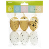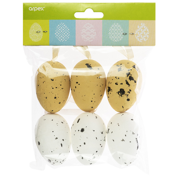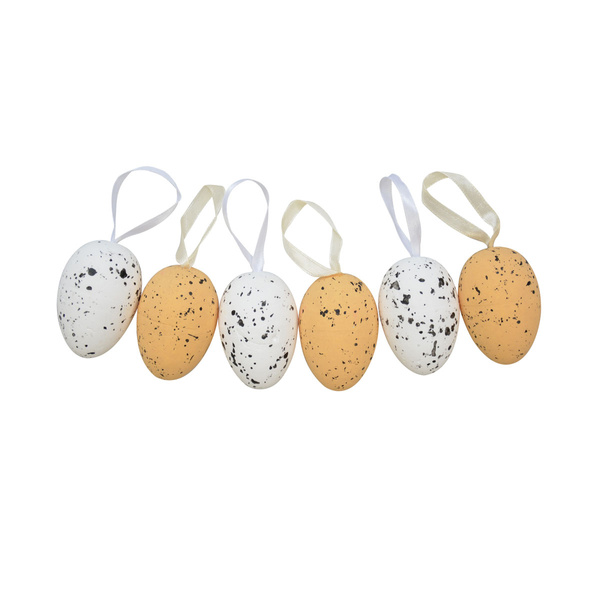 - Zestaw zawiera 6 jajek o nakrapianym wzorze – trzy w kolorze białym i trzy w kolorze naturalnym.