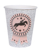- Stylowy wzór z motywem skaczącego konia i podkówek, który podkreśla klimat imprezy jeździeckiej.