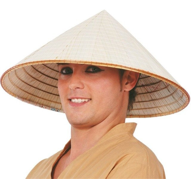 Słomkowy kapelusz w formie stożka, wiązany pod brodą.