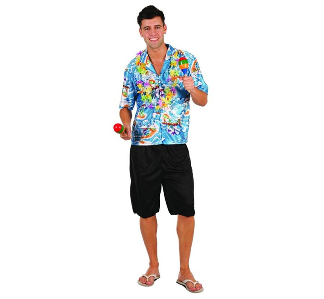 STRÓJ DLA DOROSŁYCH Rozmiar: 52 Długość całkowita koszuli: 74 cm Szerokość pod pachami: 60 cm Szerokość w pasie: 60 cm Długość rękawa: 25 cm Długość całkowita spodni: 58 cm Szerokość w pasie: 30 cm Strój zawiera dodatkowo: naszyjnik. Materiał: 100% poliester.