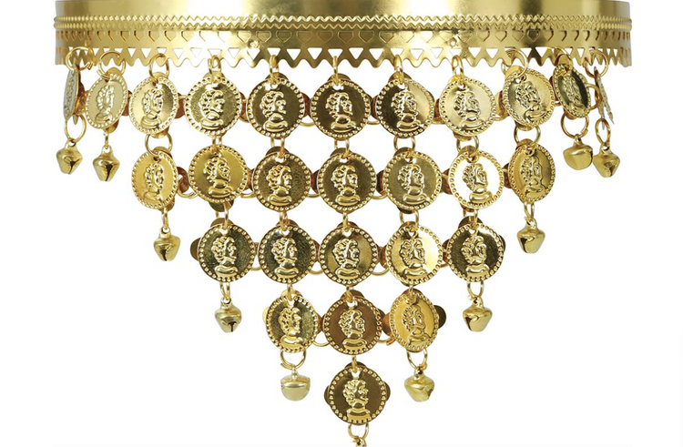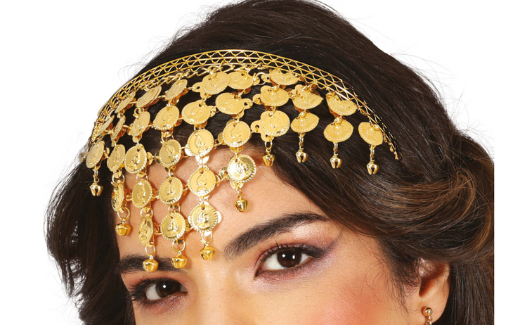• Opaska w kolorze złotym, bogato zdobiona błyszczącymi monetami.