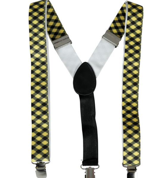 - Szelki: klasyczne, zapinane na żabki, w charakterystyczną żółto-czarną kratkę; rozmiar uniwersalny.
