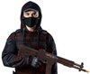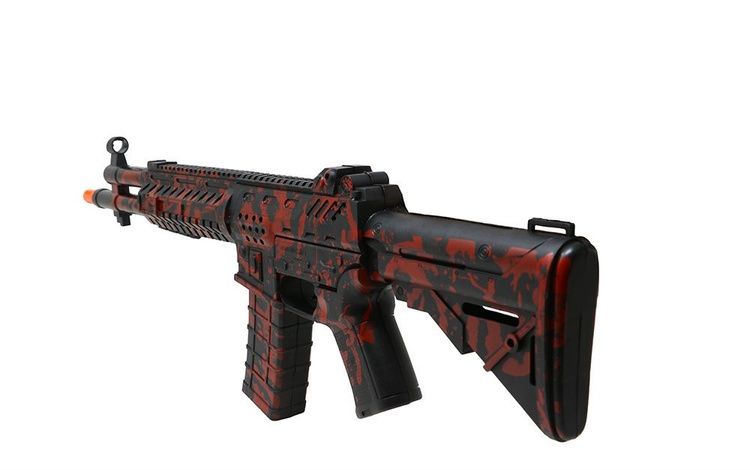 Karabin pomalowany na czerwono jakby był pokryty krwią.
