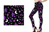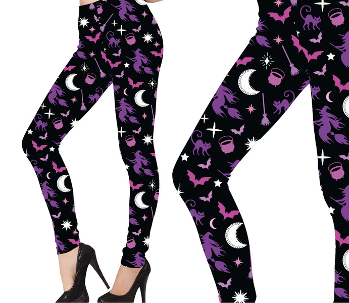 Czarne leginsy z nadrukiem fioletowych czarownic, nietoperzy, kotów itp.