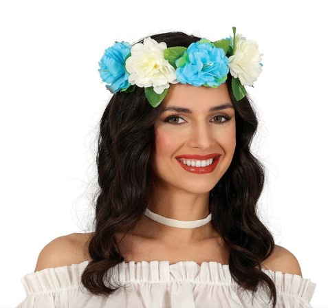 Wianek ze sztucznych kwiatów w kolorze niebiesko-białym.