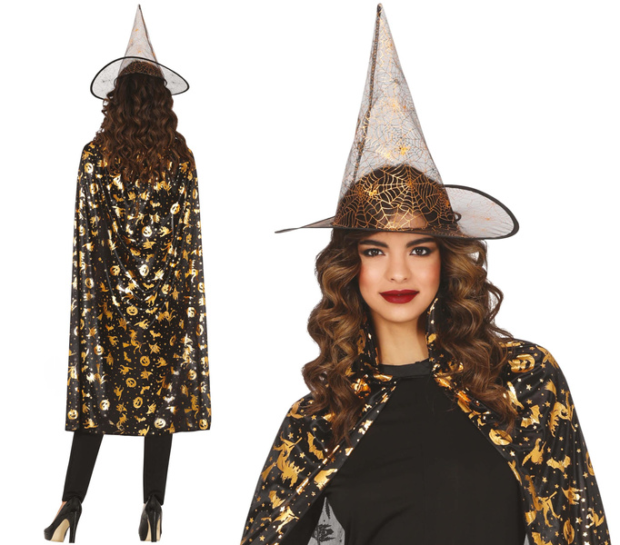 Zestaw czarownicy peleryna i kapelusz. Kolor czarny w złote wzory. Kapelusz transparentny w złote pajęczyny.
