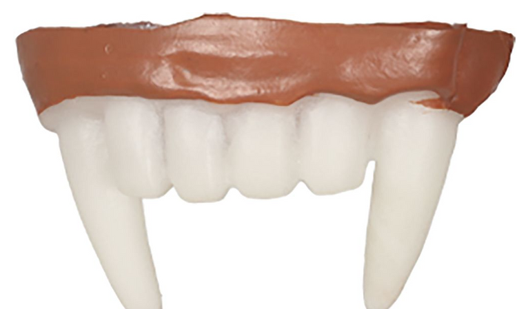 - Białe nakładki na zęby o szpiczastym, charakterystycznym kształcie .