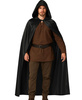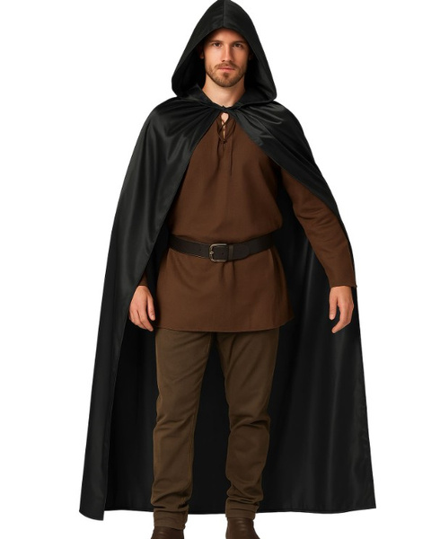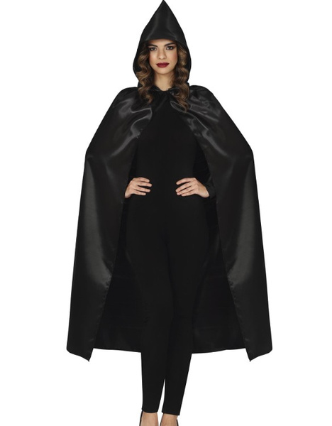 Peleryna w kolorze czarnym zdobiona kapturem.