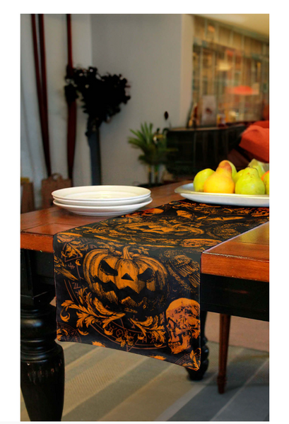 - Bieżnik w kolorze głębokiej czerni z pomarańczowym nadrukiem dyni, czaszek, nietoperzy oraz okultystycznych symboli.
